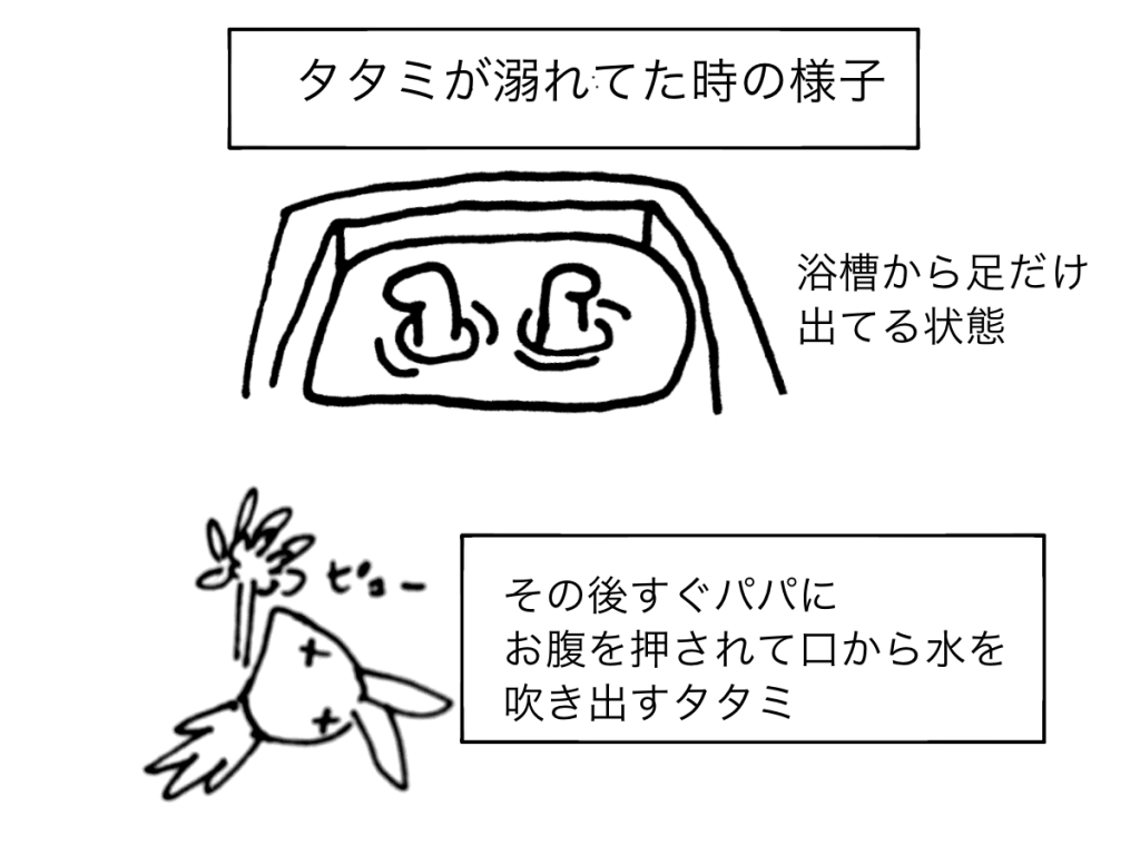 タタミ、家のお風呂の浴槽で溺れます。なぜそんな事になったかというと、タタミのクラスにかっこいい男の子が転校してくる→その男の子はスイミングスクールに通っているようだ→タタミは彼と仲良くなりたいと思う→カナヅチのためスイミングに行くのは恥ずかしい→ならば家のお風呂で練習を→浴槽で溺れる、という流れ。
